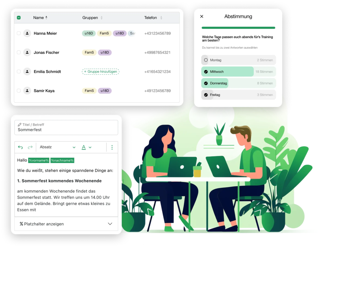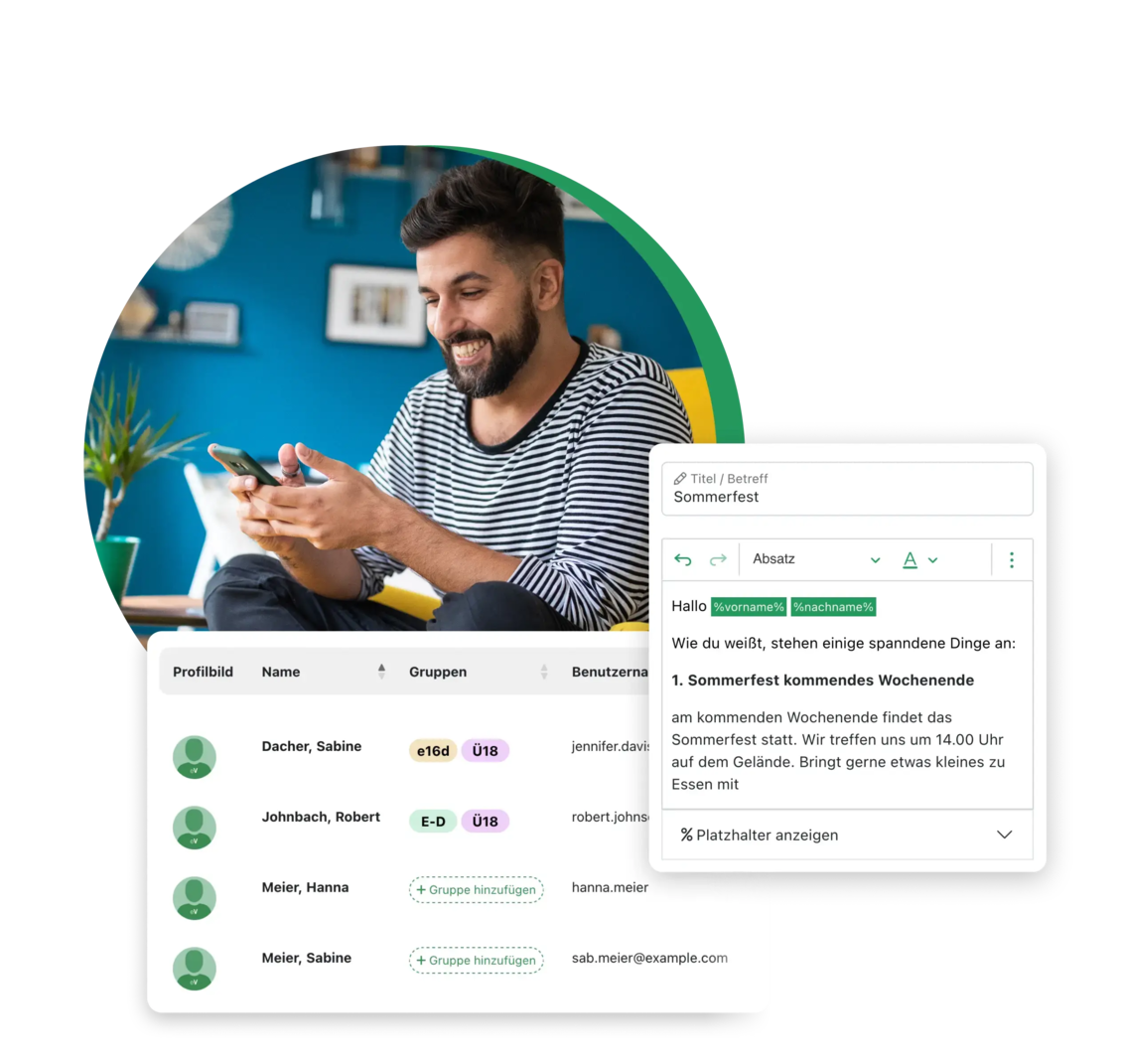 Verwaltet alle eure Mitglieder, Förderer und Partner sicher und übersichtlich in einer digitalen Datenbank. Dank smarter Filterfunktionen und integrierten Kommunikationstools pflegt ihr eure Kontakte effizient, persönlich und zu 100 % DSGVO-konform.