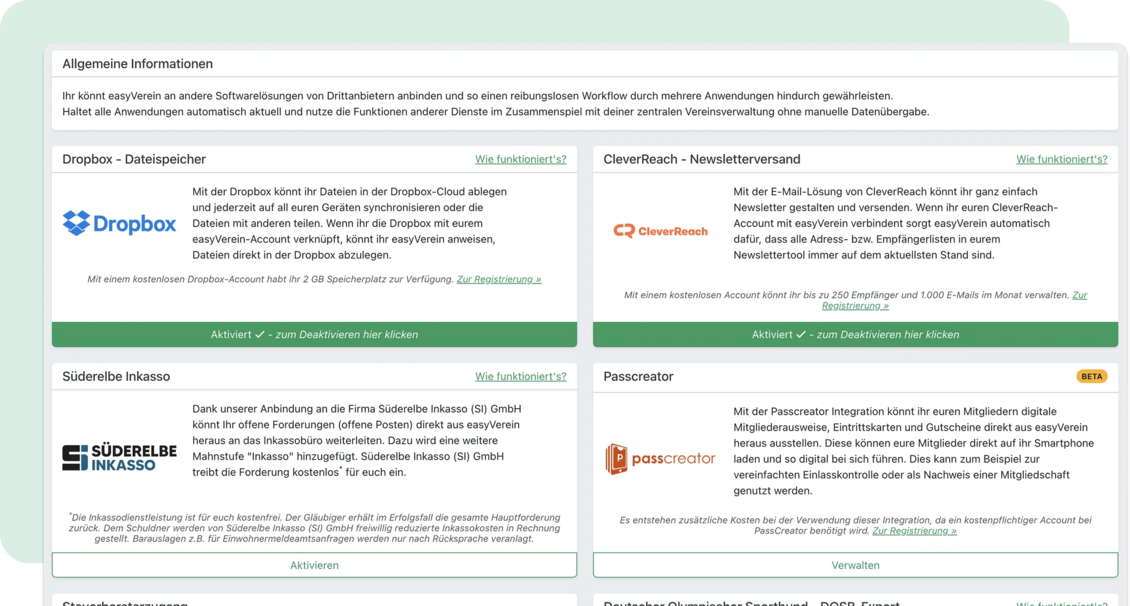 Euer Verein nutzt bereits andere Softwarelösungen für spezielle Aufgaben? Kein Problem: Durch unsere offene REST-API und zahlreiche fertige Integrationen lässt sich easyVerein reibungslos in eure bestehende IT-Infrastruktur einbetten.